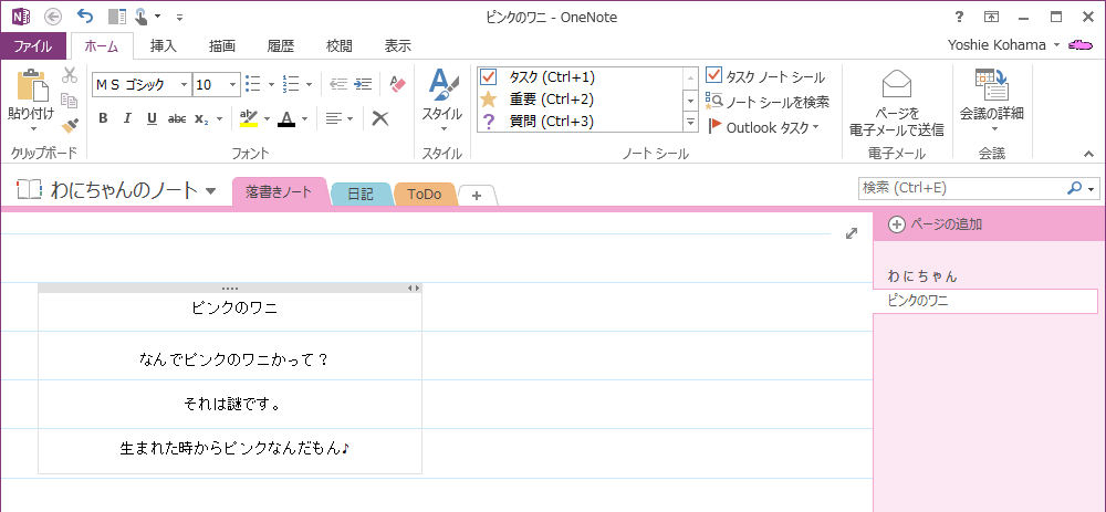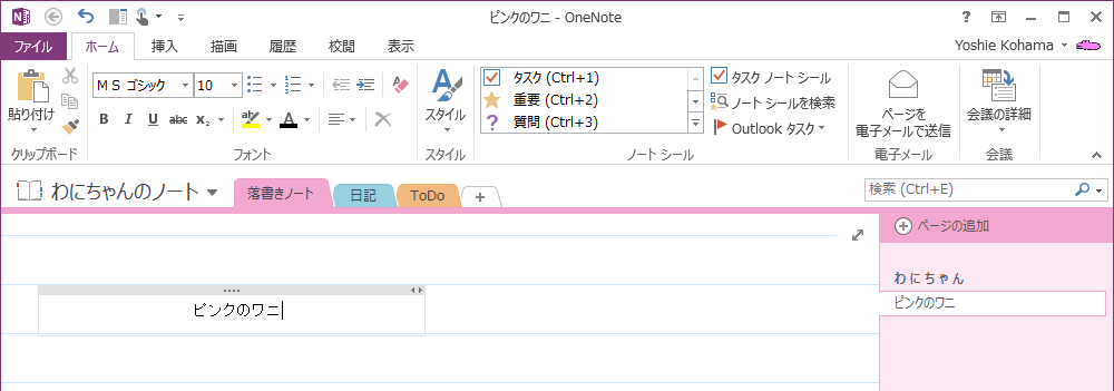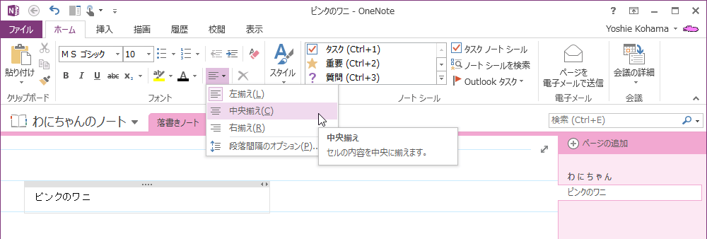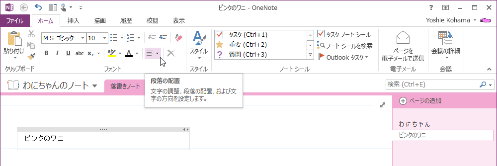 OneNote 2013でコンテナの範囲内で、段落を左寄せから中央揃え等に変更することができます。[ホーム]タブの[フォント]グループにある[段落の配置]の▼をクリックして、配置方法を選択します。なお、段落の間隔を調整することも可能です。