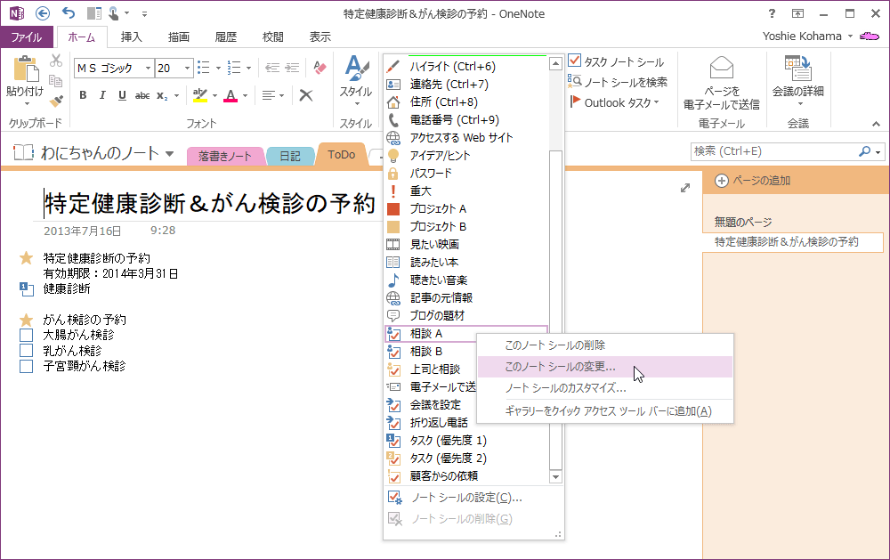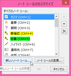OneNote 2013標準で用意されているノートシールのなかに、「相談A」「相談B」といったものがあり、これらは値を置き換えて利用することが前提となっています。そのほかにオリジナルのノートシールを作るには、[ホーム]タブの[ノートシール]グループの▼をクリックし、[ノートシールの設定]をクリックして、それぞれ設定します。