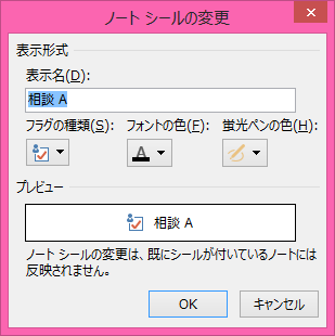 - [新しいノートシール]ダイアログボックスが表示されたら、表示名、フラグの種類、フォントの色、蛍光ペンの色を設定して[OK]ボタンをクリックします。