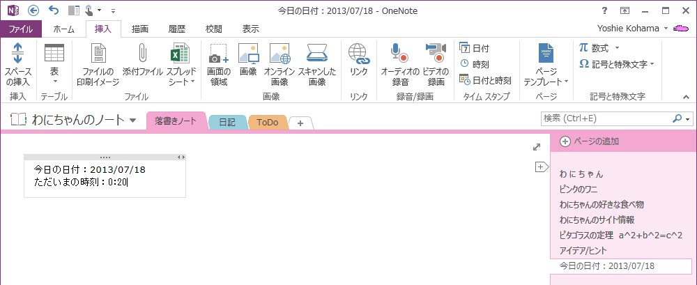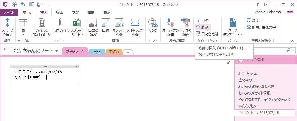OneNote 2013で現在の時刻をすばやく挿入するには、挿入したい場所にカーソルを移動して、[挿入]タブを開き、[タイムスタンプ]グループの[時刻]をクリックします。ショートカットキーはAlt+Shift+Tです。