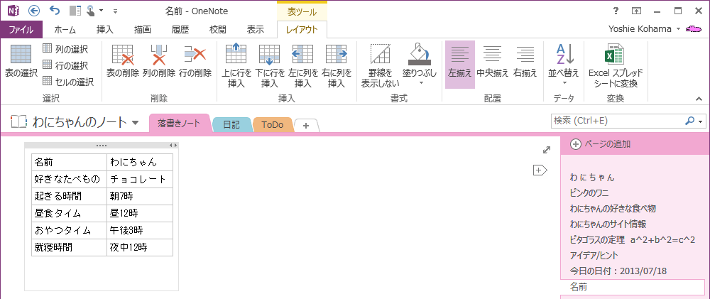 OneNote 2013で対象となる行・列、または表を選択して[表ツール]の[レイアウト]タブを開き、[削除]グループから削除する対象のコマンドを選択します。