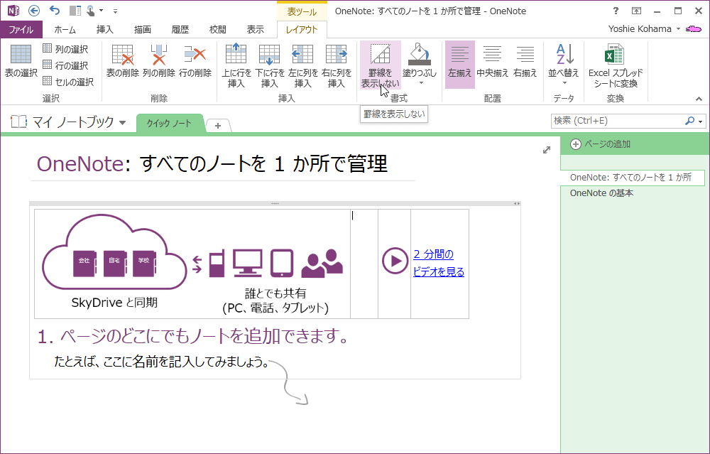 OneNote 2013で表をレイアウト枠代わりに利用する場合、罫線を非表示にするとよいでしょう。[表ツール]の[レイアウト]タブを開き、[書式]グループの[罫線を表示しない]をクリックします。もう一度クリックすると罫線が再表示されます。