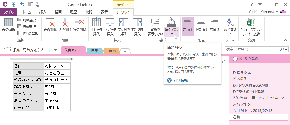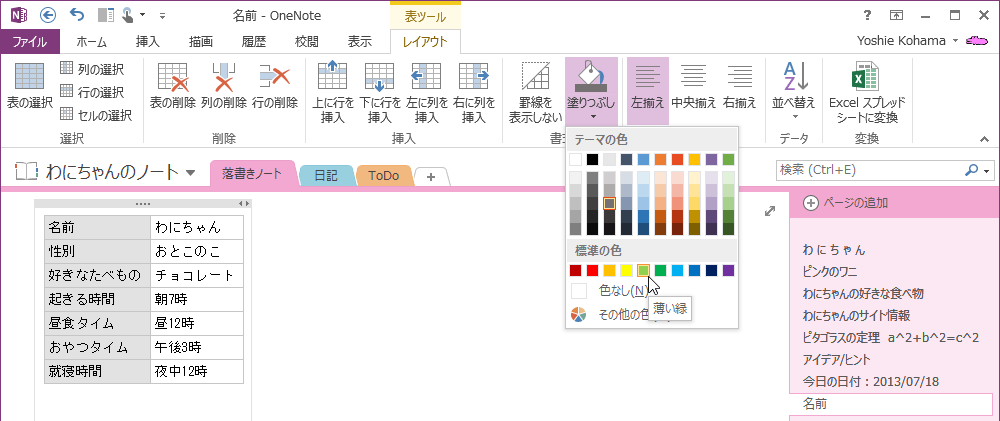 OneNote 2013で背景色を変更したいセルを選択して、[表ツール]の[レイアウト]タブを開き、[塗りつぶし]の▼をクリックして一覧から塗りつぶしたい色を選択します。