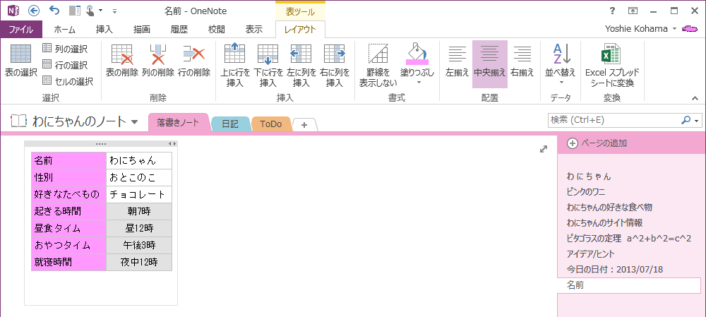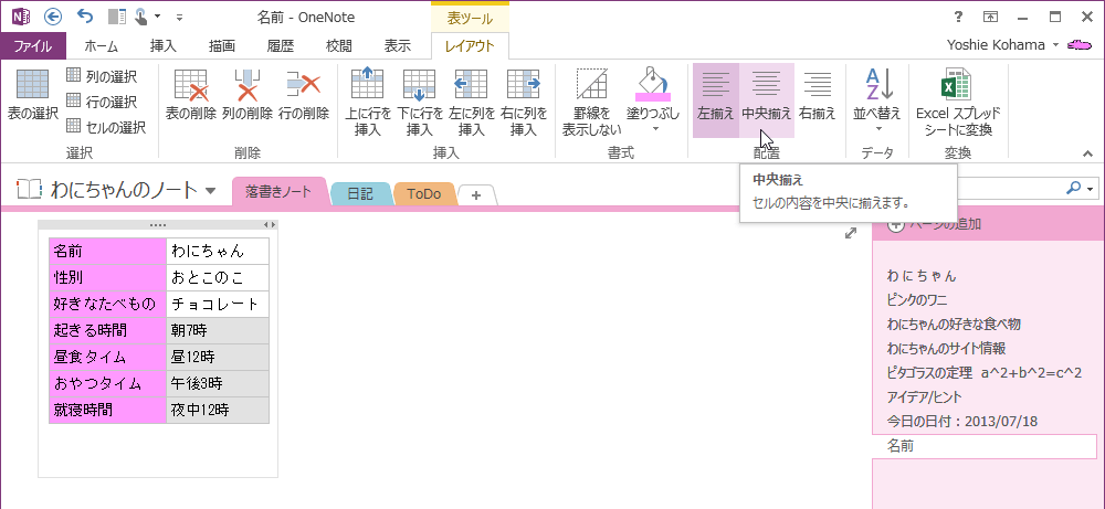 OneNote 2013で配置を変更したいセルを選択して、[表ツール]の[レイアウト]タブを開き、[配置]グループの中から配置方法を選択します。左揃えや右揃えの場合はショートカットキーを利用するとスムーズです。左揃えはCtrl+L、右揃えはCtrl+Rです。