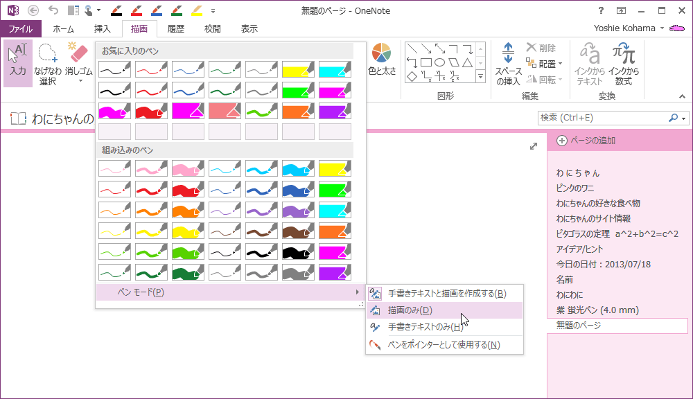 OneNote 2013既定のペンモードは[手書きテキストと描画を作成する]が選択され、手書きテキストと判断されるものはテキストとして認識、それ以外は描画として扱われます。これを[描画のみ]として扱うか、[手書きテキストのみ]として扱うかペンモードを選択できます。