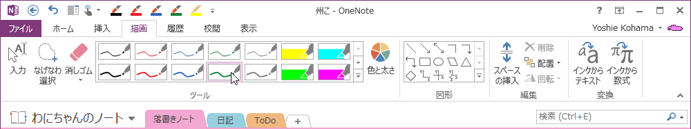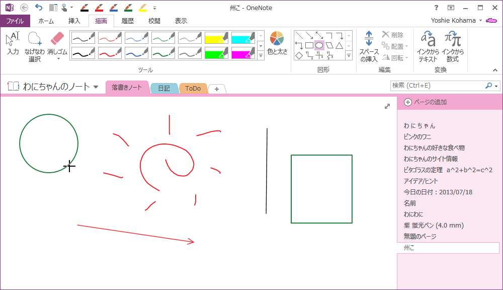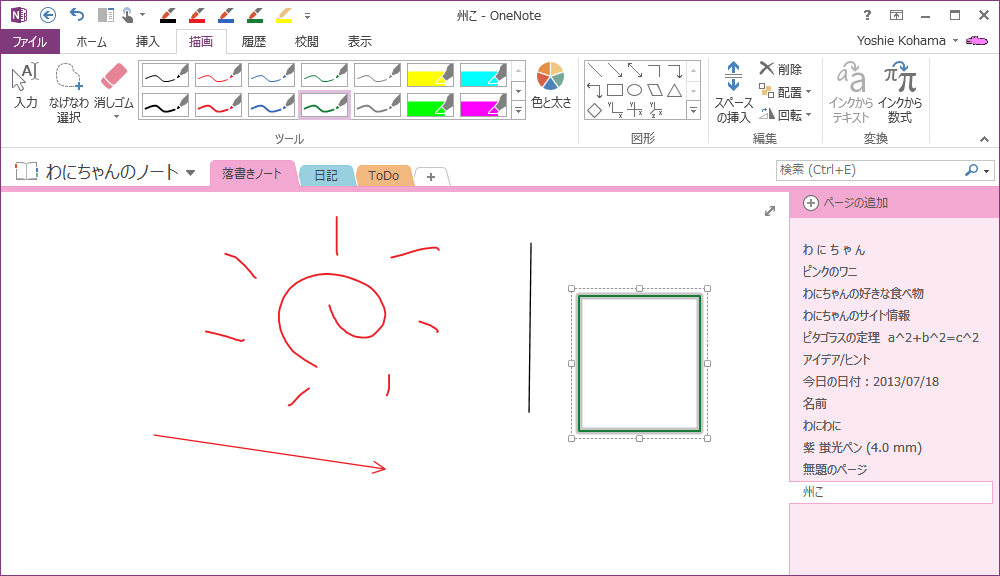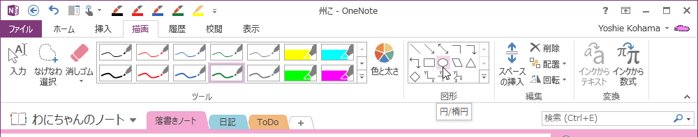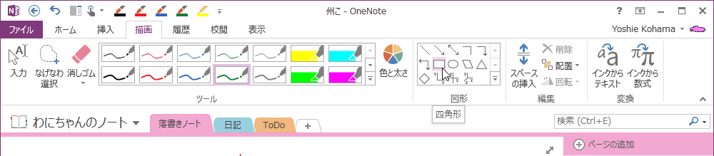 OneNote 2013で[描画]タブの[図形]グループには四角形や円などの図形が用意され、選択してドラッグすることで図形を描くことができます。まず、線の色と太さを選択し、[図形]グループから描きたい図形の種類を選択して、対角線上にドラッグします。