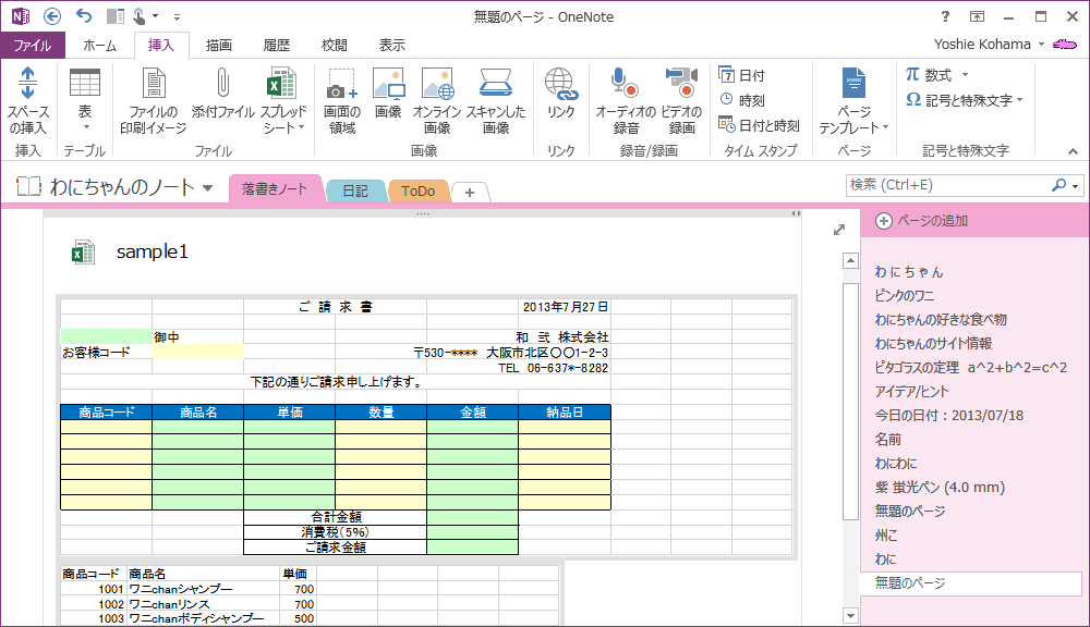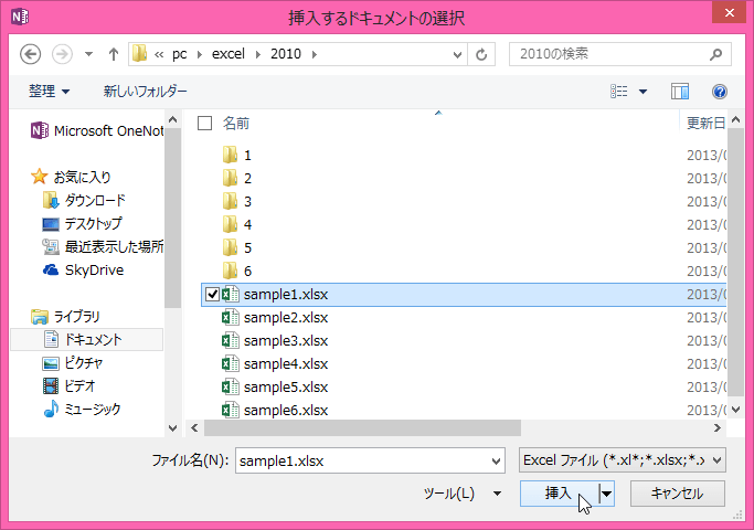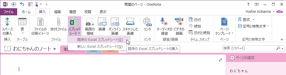 OneNote 2013で既存のExcelスプレッドシートのイメージをページに追加するには、[挿入]タブを開き、[ファイル]グループの[スプレッドシート]を選択して、[既存のExcelスプレッドシート]を選択し、対象となるExcelのファイルを選択します。複数のシートに分かれている場合は、表やグラフ単位で挿入することができます。