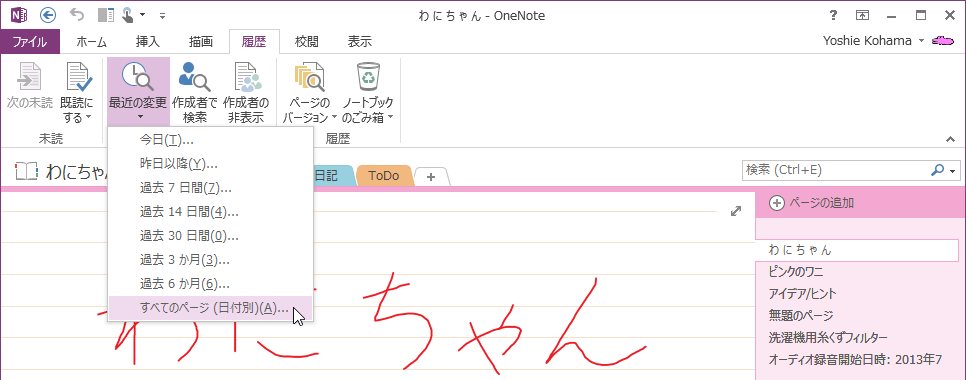 OneNote 2013で最近変更したノートブックのページを表示するには、[履歴]タブを開き、[作成者]グループの[最近の変更]をクリックして、対象となる日時を指定します。