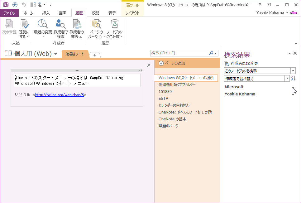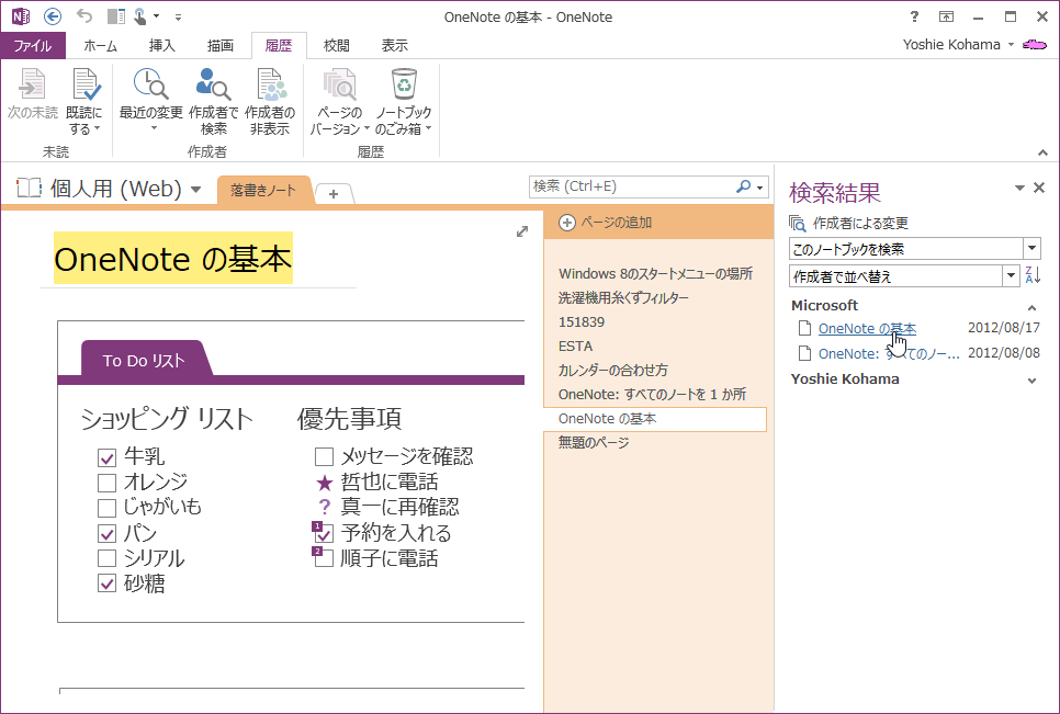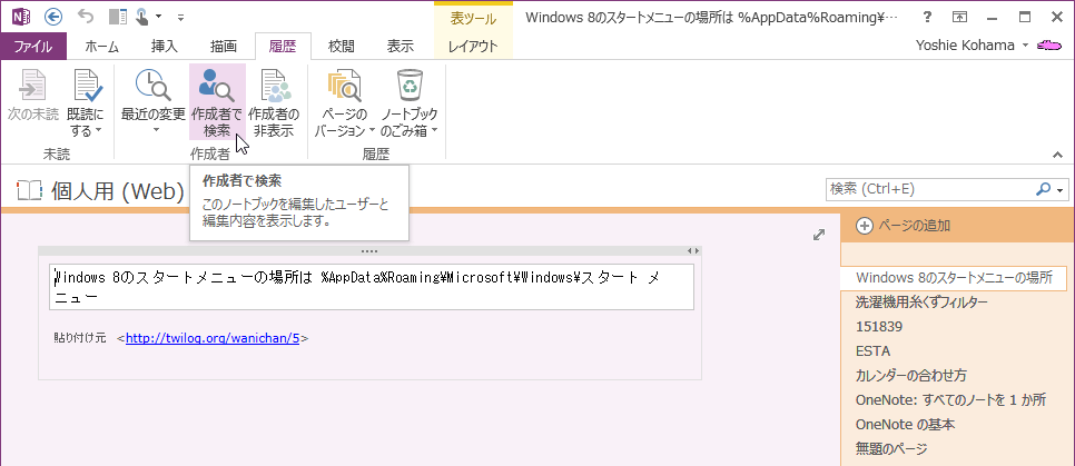 OneNote 2013で現在作業中のノートブックを編集したユーザーと編集内容を表示するには、[履歴]タブを開き、[作成者]グループの[作成者で検索]をクリックします。