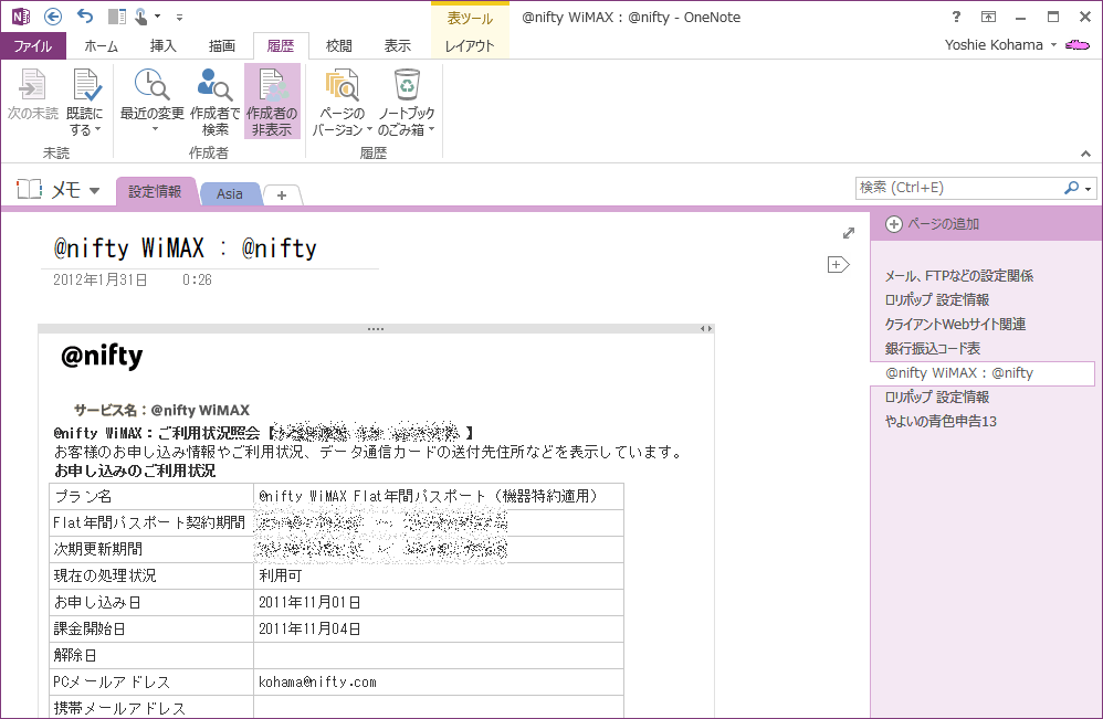 OneNote 2013既定では、作成者のイニシャルがコンテナの右側に表示されます。その作成者を非表示にするには、[履歴]タブを開き、[作成者]グループの[作成者の非表示]をクリックします。