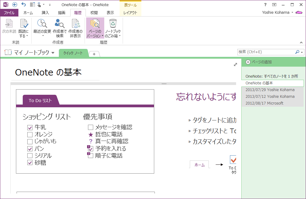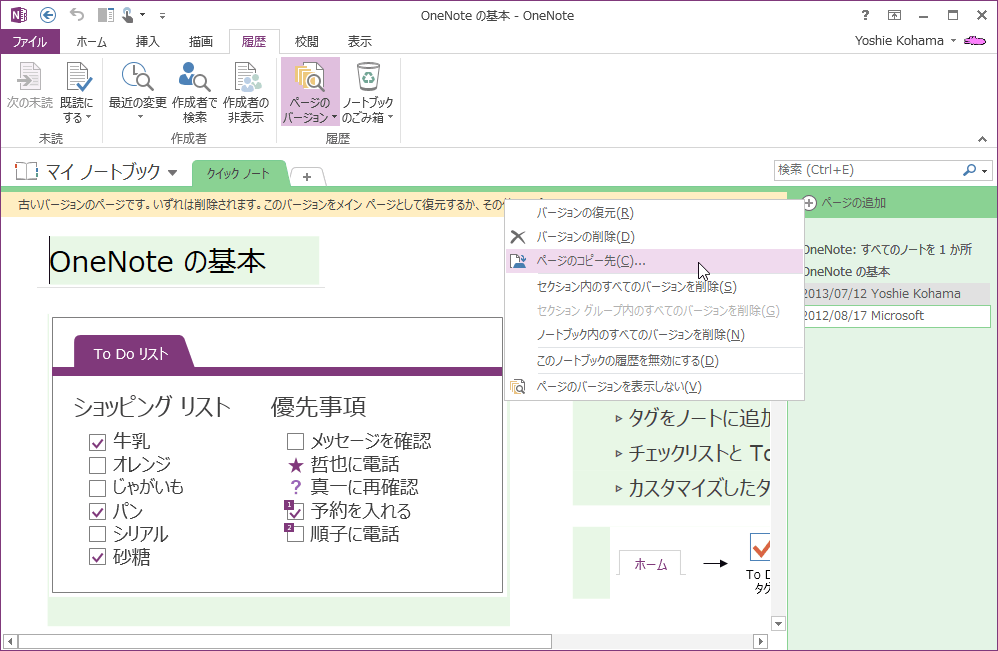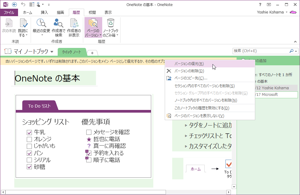 OneNote 2013でメインページとして復元したいバージョンを開き、情報バーをクリックして[バージョンの復元]をクリックするか、バージョンのページタブを右クリックしてショートカットメニューより[バージョンの復元]をクリックします。
