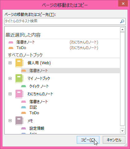 メインページとして復元するほかに、別のセクションにコピーすることも可能です。情報バーをクリックして、[セクションへコピー]を選択して、コピー先のセクションを選択します。