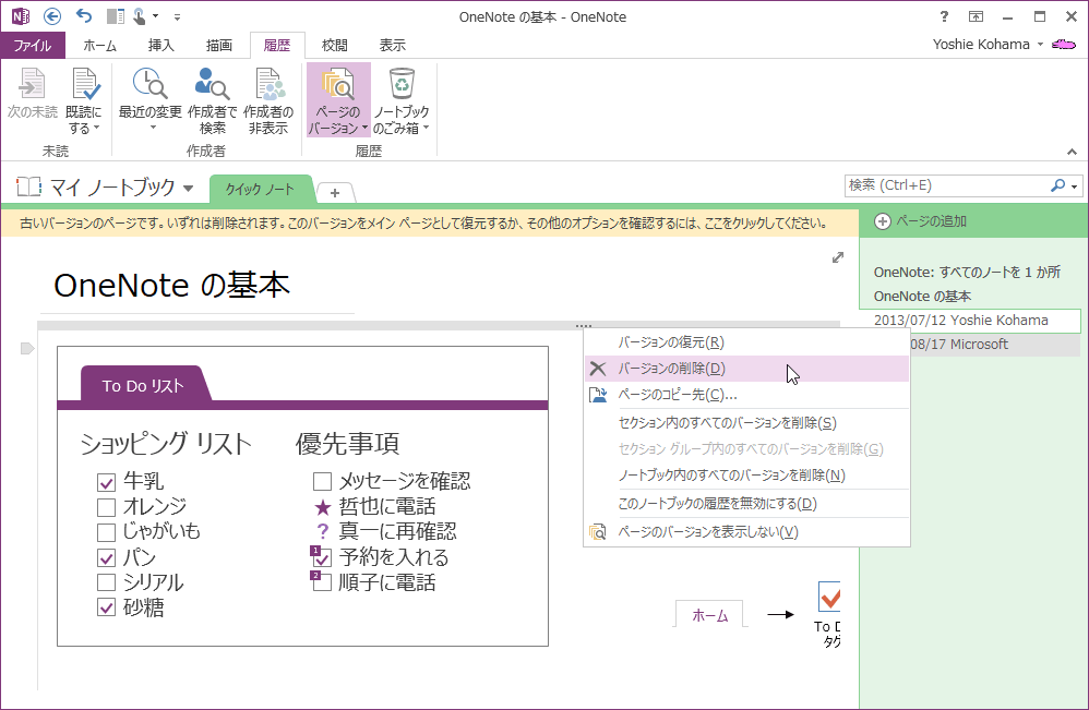 OneNote 2013でバージョンの一覧から要らないバージョンを開き、情報バーをクリックして[バージョンの削除]を選択するか、そのバージョンのページタブを右クリックしてショートカットメニューより[バージョンの削除]を選択します。