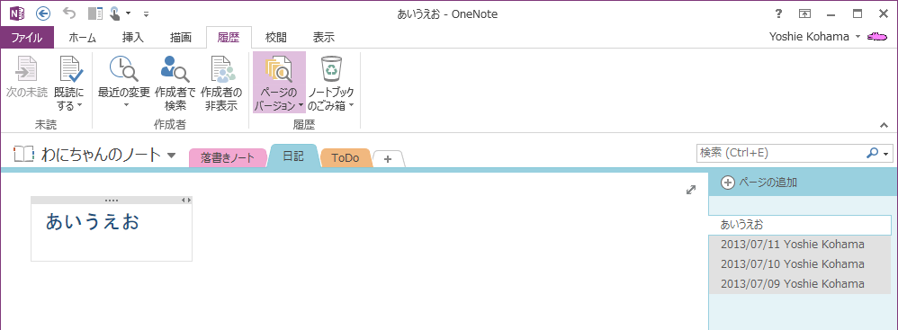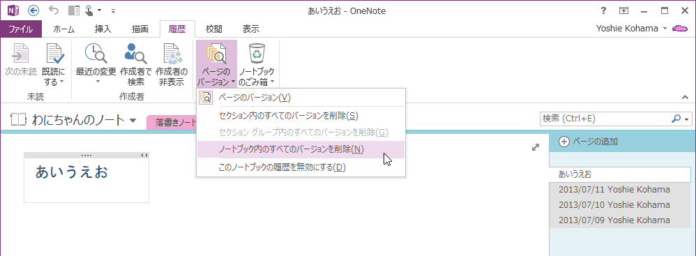 - [履歴]タブの[ページのバージョン]の▼をクリックして、[ノートブック内のすべてのバージョンを削除]を選択します。