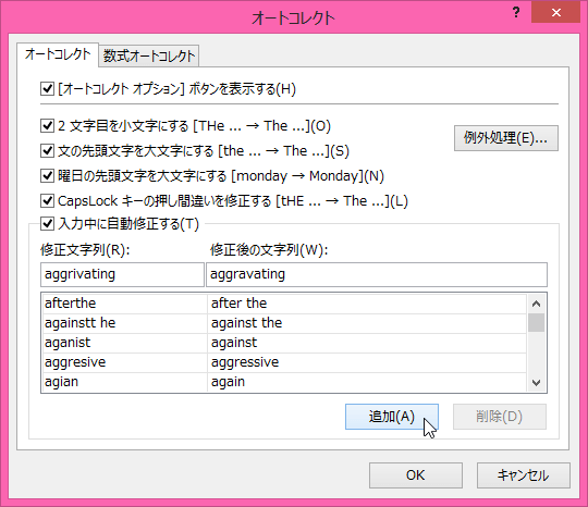 入力中に自動修正する文字列を追加するには