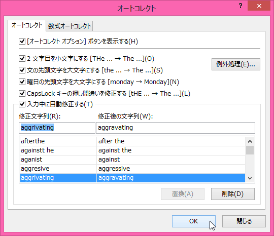 - [オートコレクト]ダイアログボックスの[OK]ボタンをクリックします。