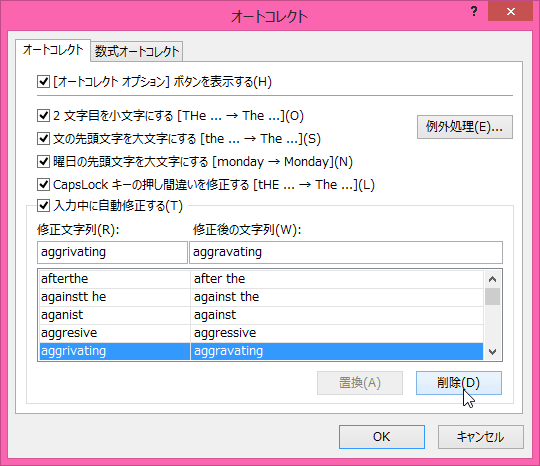 - [修正文字列]に文字を入力すると、該当するオートコレクトが選択されるので、[削除]ボタンをクリックします。