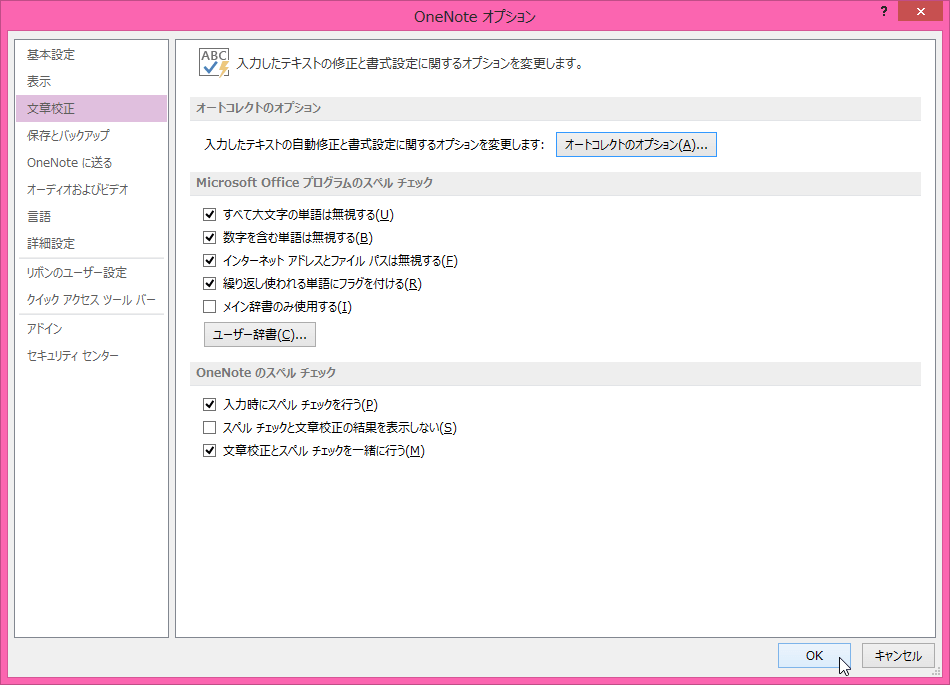 - [OneNoteオプション]ダイアログボックスの[文章校正]タブを開きます。