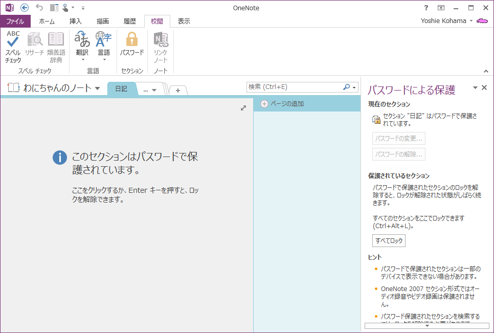 OneNote 2013でロックされたセクション内のページは検索対象から除外されます。パスワードで保護されたセクションを検索するには、まずセクションのロックを解除する必要があります。