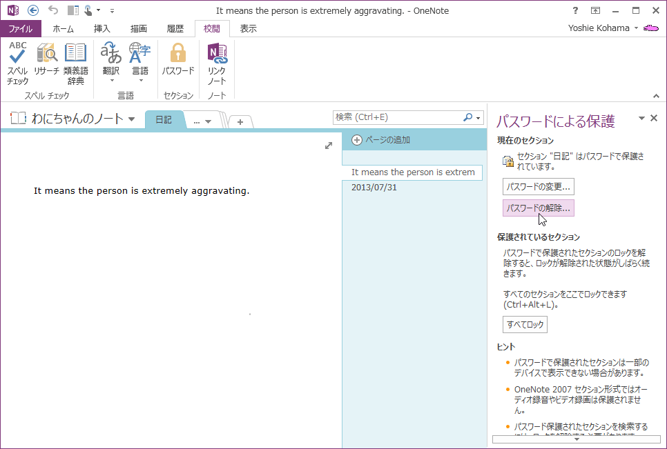 特定のノートブック セクションを保護する必要がなくなった場合は、OneNote 2013でそのパスワードを解除することができます。[パスワードによる保護]作業ウィンドウを表示し、[パスワードの解除]ボタンをクリックします。