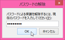 - [パスワードによる保護]作業ウィンドウの[パスワードの解除]ボタンをクリックします。