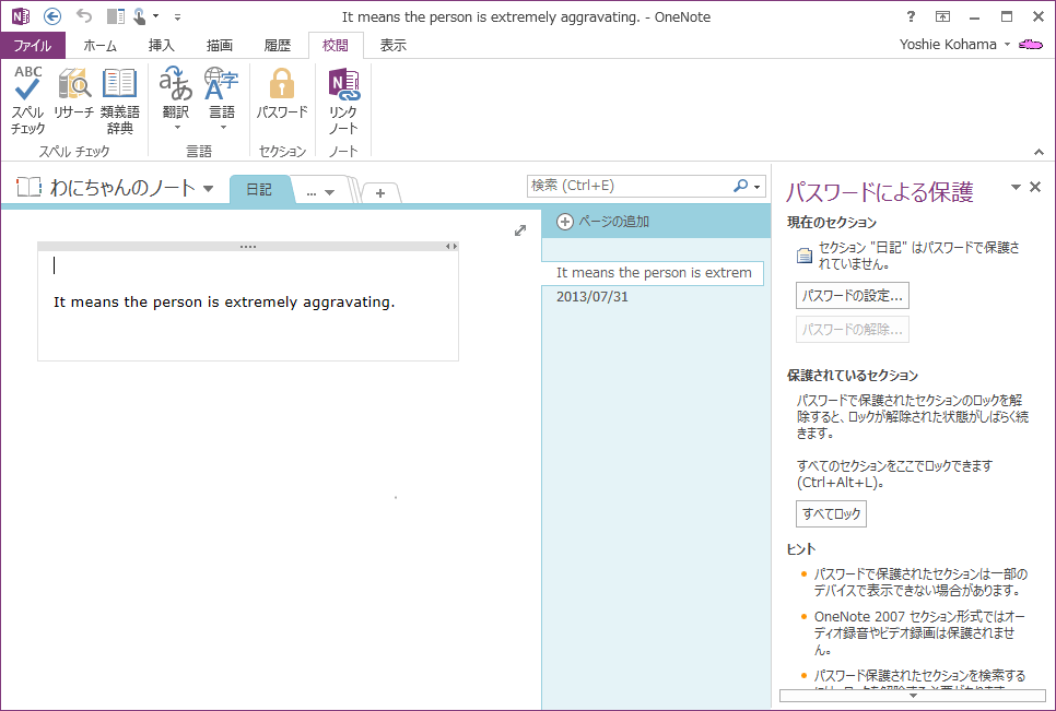 - 対象となるセクション内のページを開き、[校閲]タブの[パスワード]をクリックするか、そのセクションを右クリックしてショートカットメニューより[このセクションをパスワードで保護]をクリックします。