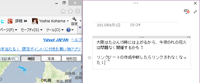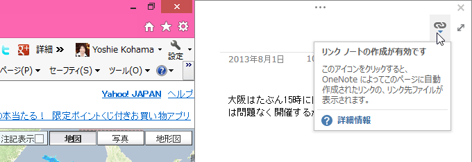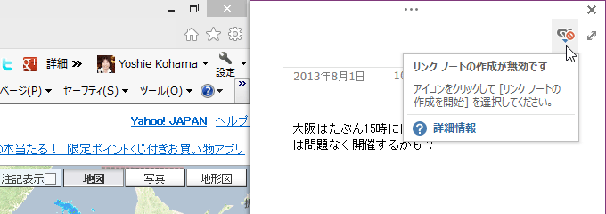 OneNote 2013でドッキングウィンドウのリンクノートの有効/無効のアイコンをクリックして、リンクノートの作成を中断できます。