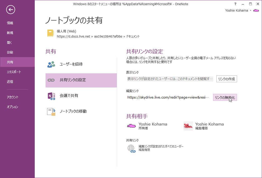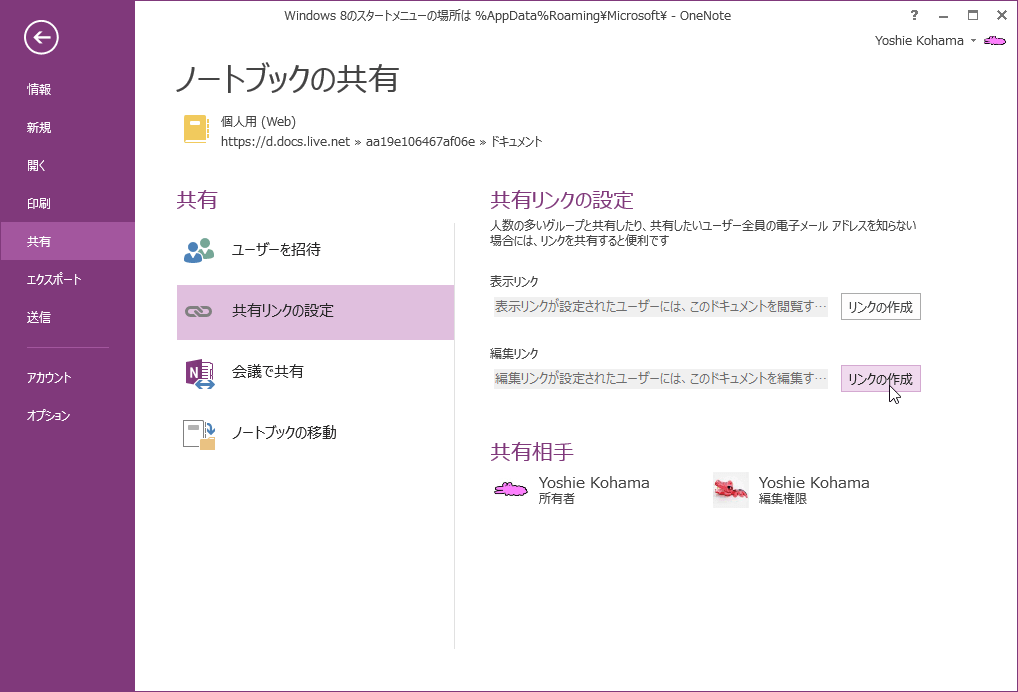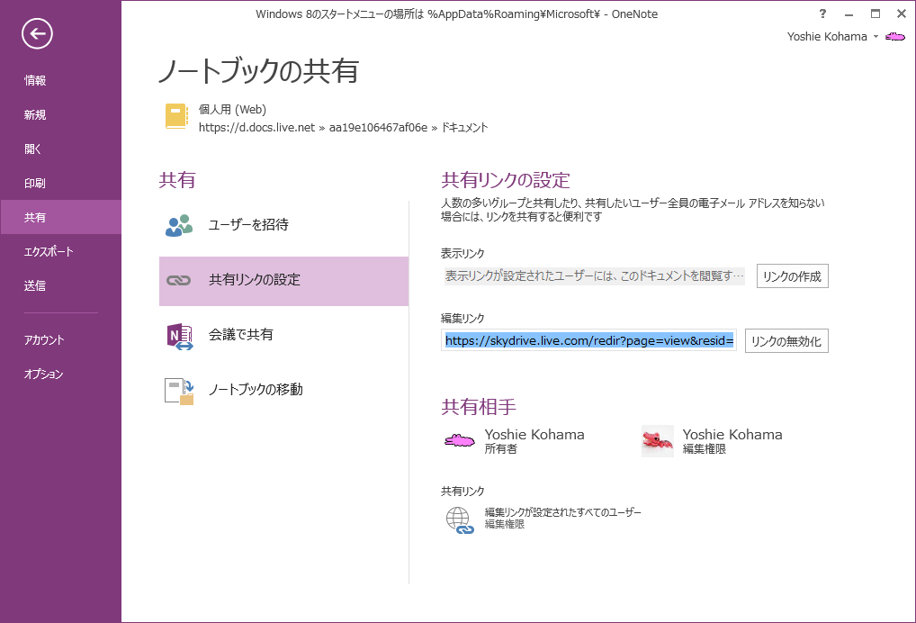 人数の多いグループと共有したり、共有したいユーザー全員の電子メールアドレスを知らない場合、そのグループ全員で共有してノートブックを編集できるようにするには、OneNote 2013で編集リンクを作成するとOKです。