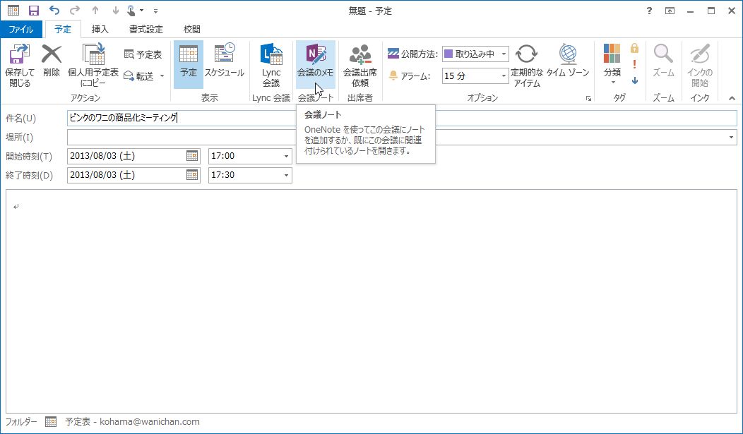 - Outlook 2013 で、ノートを取る予定または会議を開きます。