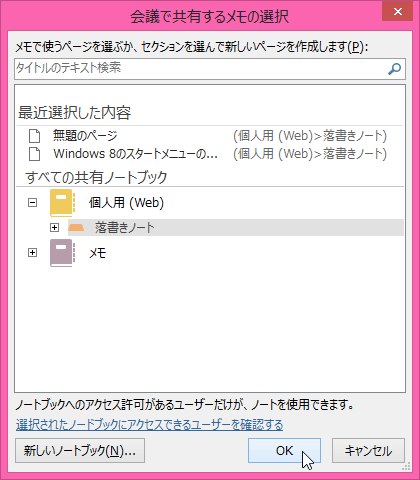 - [OneNote の場所の選択] ダイアログ ボックスで、新しいノートのセクションを選び、[OK] ボタンをクリックします。