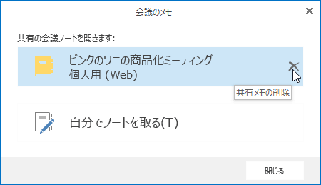 - 確認メッセージが表示されるので、共有メモを削除する場合は[ノートの削除]ボタンをクリックします。