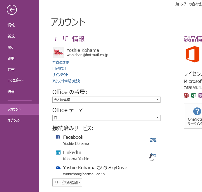 FacebookやTwitter、あるいはLinkedInとの接続済みサービスを管理するには、OneNote 2013で[ファイル]タブを開き、[アカウント]タブを開いて、[接続済みサービス]一覧から管理したい接続済みサービスの[管理]のリンクをクリックします。ここで接続を解除することも可能です。