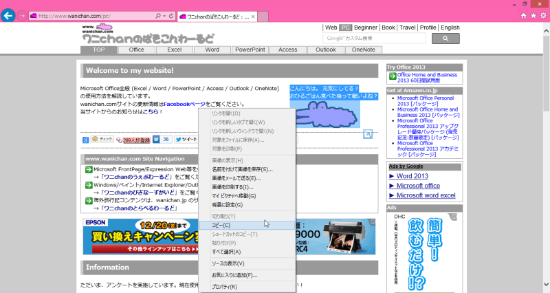 - Webページ上でコピーしたい部分を範囲指定して、ショートカットキーのCtrlキーを押しながらCキーを押すか、右クリックしてショートカットメニューより[コピー]を選択します。