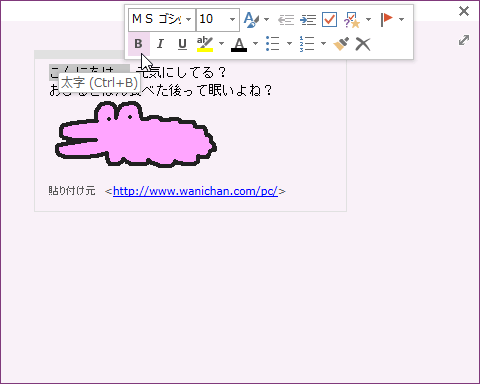 - クイックノートにクリップボードに貼り付けたものを貼り付けます。ショートカットキーはCtrlキーを押しながらVキーでOKです。リボンコマンドを利用する場合はクイックノートの上帯をクリックして[ホーム]タブの[貼り付け]をクリックします。