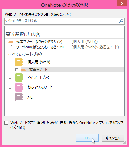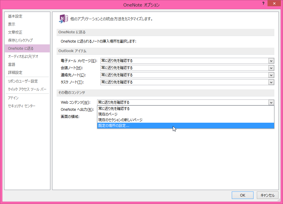OneNote 2013既定では、Webコンテンツの送り先は毎回確認する画面が表示されます。もし、その送り先を固定したい場合、[OneNoteオプション]ダイアログボックスの[OneNoteに送る]タブを開き、[Webコンテンツ]のボックス一覧から選択します。