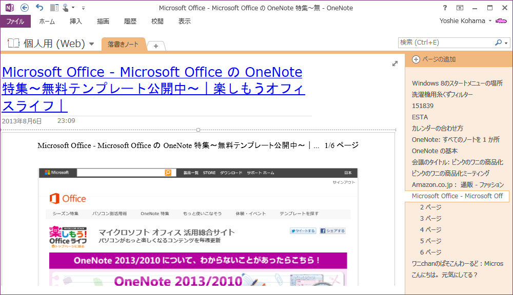 OneNote 2013の[OneNoteに送る]ツールを使って、[OneNoteに送る]で表示しているWebページの印刷イメージをOneNoteに取り込む方法について説明します。