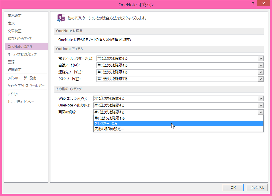 もし、その送り先を固定したい場合、[OneNoteオプション]ダイアログボックスの[OneNoteに送る]タブを開き、[画面の領域]のボックス一覧から選択します。