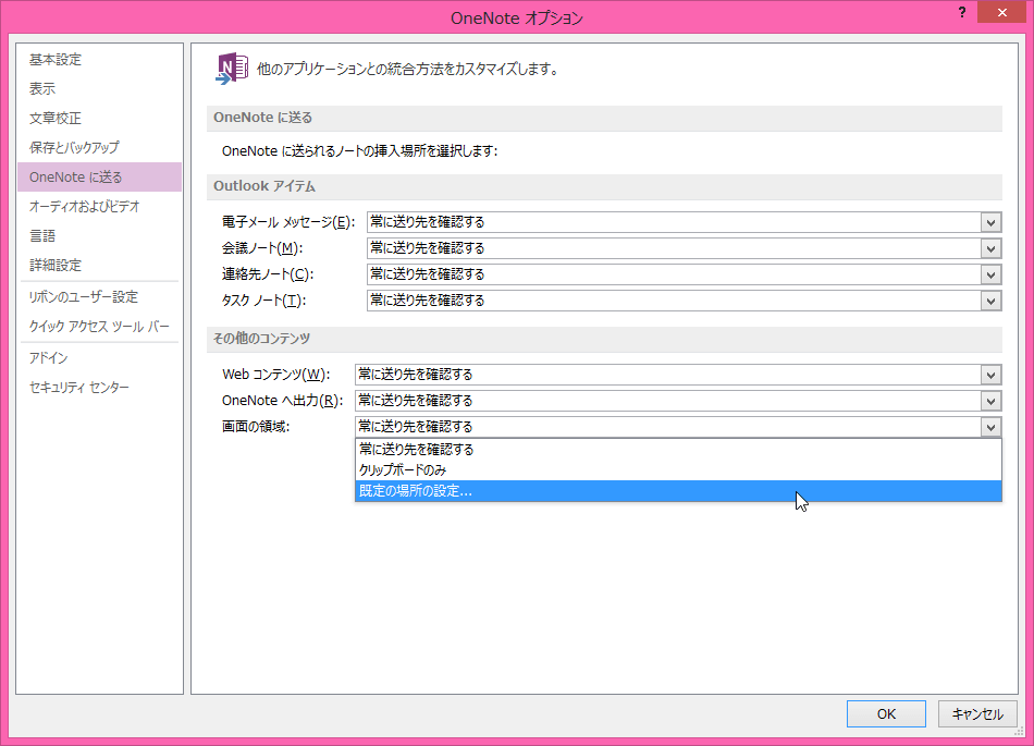 コピーされた画面の領域の保存先は、既定では[OneNoteの場所の選択]ダイアログボックスが表示されて毎回場所を確認する必要がありますが、決まった場所に保存したい場合は、OneNote 2013で[OneNoteオプション]ダイアログボックスの[OneNoteに送る]タブを開き、[画面の領域]ボックスから指定します。