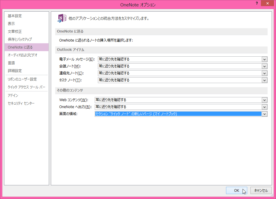 - [OneNoteオプション]ダイアログボックスの[OneNoteに送る]タブを開きます。