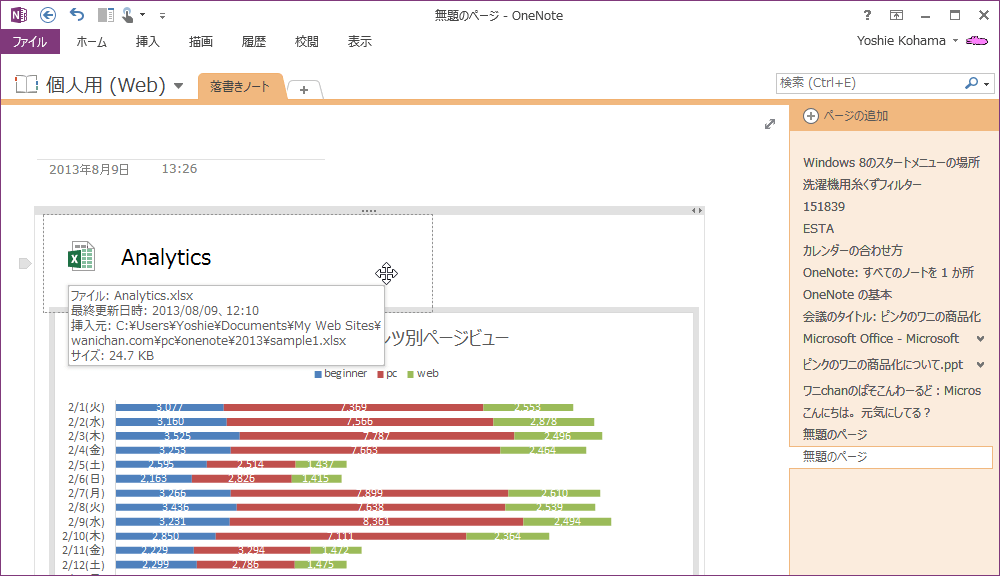 OneNote 2013でExcelスプレッドシートのアイコンを右クリックしてショートカットメニューより[名前の変更]をクリックし、名前を入力します。