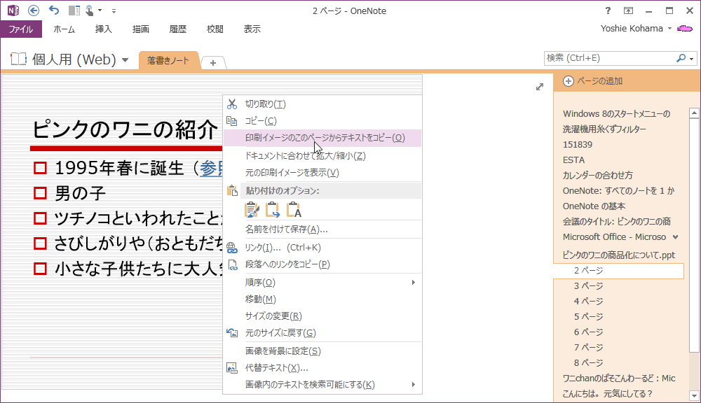 OneNote 2013のページに挿入された印刷イメージの全ページからテキストをコピーするには、その印刷イメージを右クリックしてショートカットメニューより[印刷イメージのこのページからテキストをコピー]を選択します。
