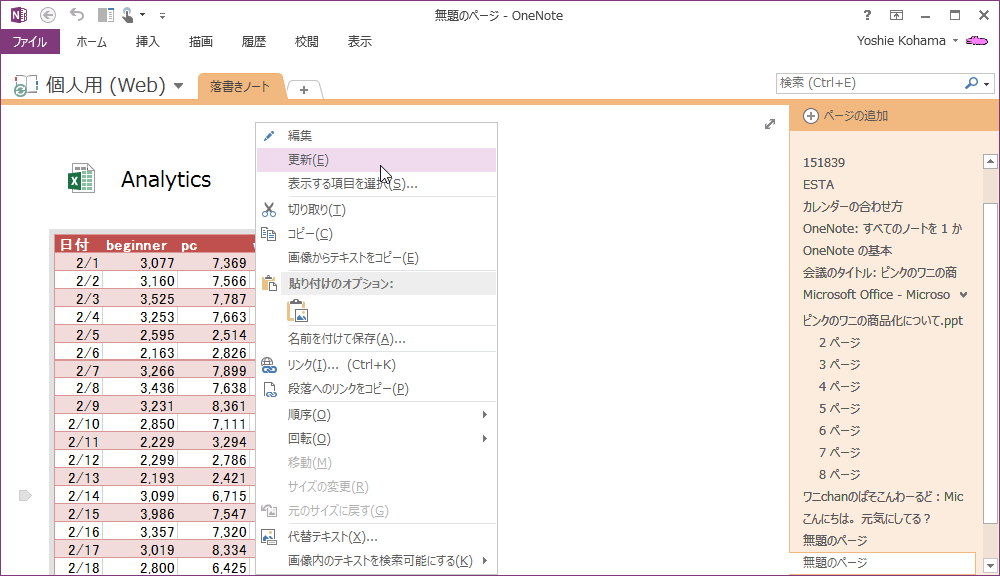 ノートブックを共有している場合、他の誰かがスプレッドシートをExcelで編集して保存した結果を最新の情報に更新したい場合、OneNote 2013でそのスプレッドシートのイメージを右クリックしてショートカットメニューより[更新]をクリックします。