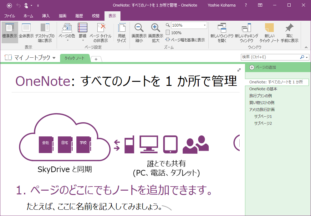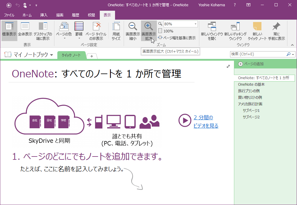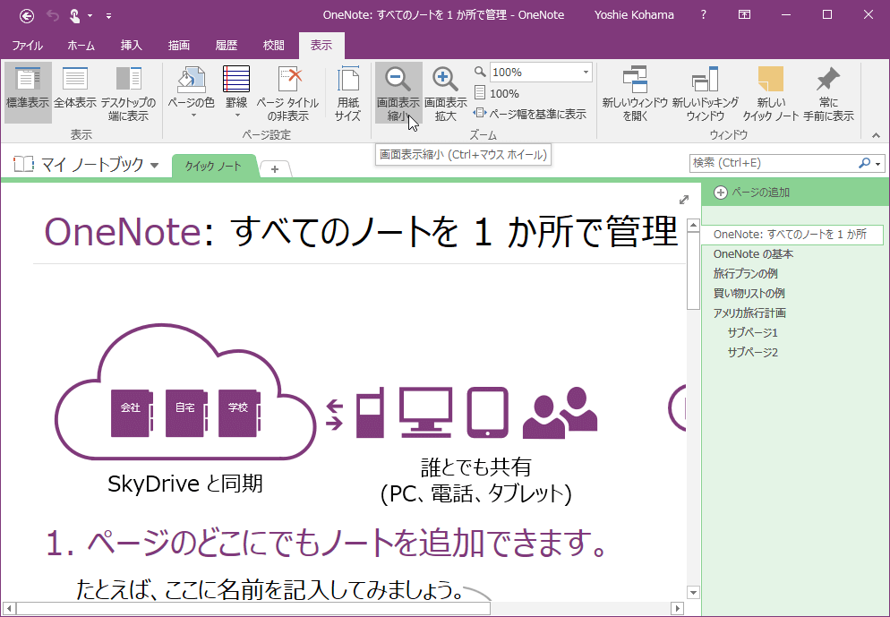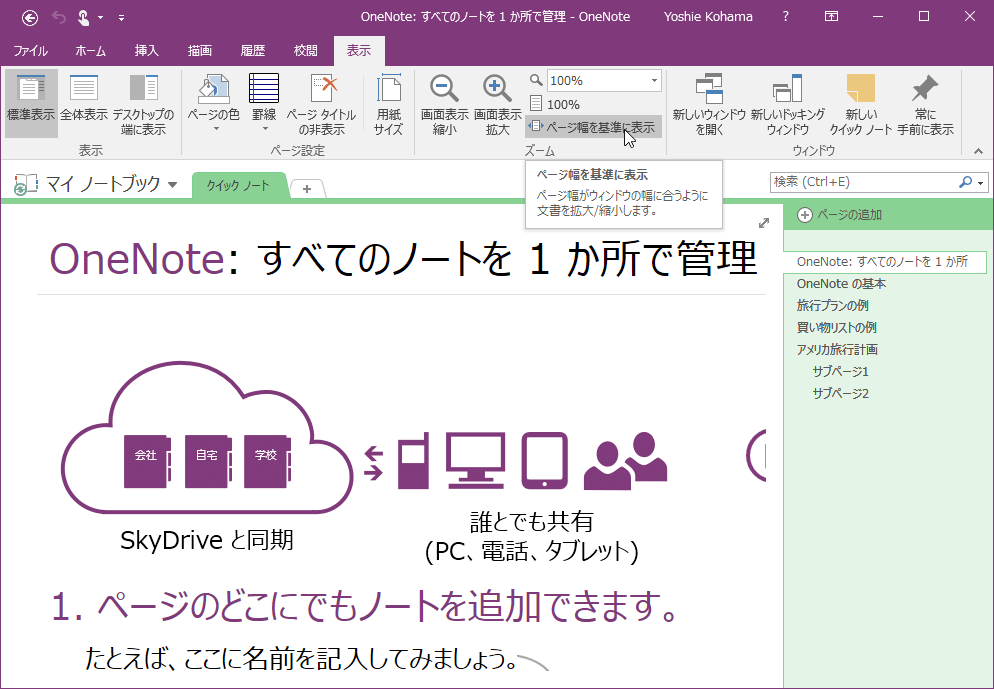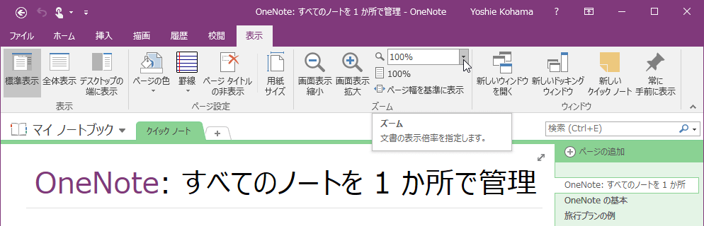 OneNote 2016で[表示]タブを開き、[ズーム]グループで拡大・縮小、または表示倍率を[ズーム]ボックスから指定します。なお、ページ幅を基準に表示することも可能です。