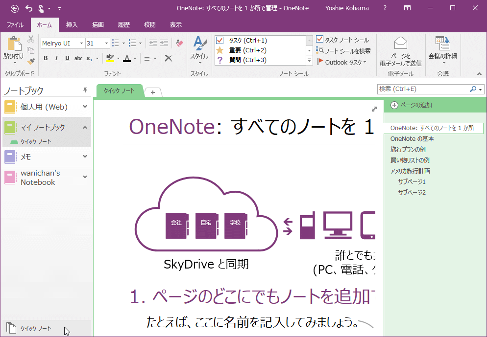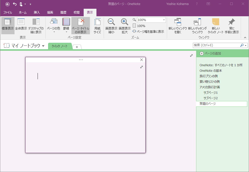- [表示]タブを開き、[ウィンドウ]グループの[新しいクイックノート]をクリックします。