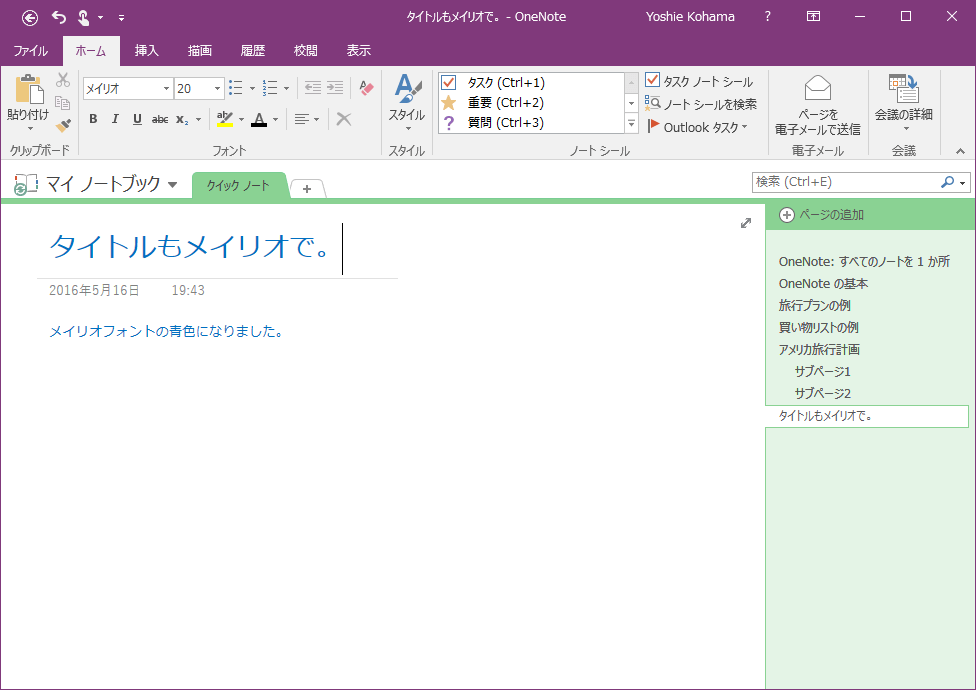 ノート テキストで別のフォント、サイズ、色を使いたい場合、OneNoteオプションで設定変更できます。