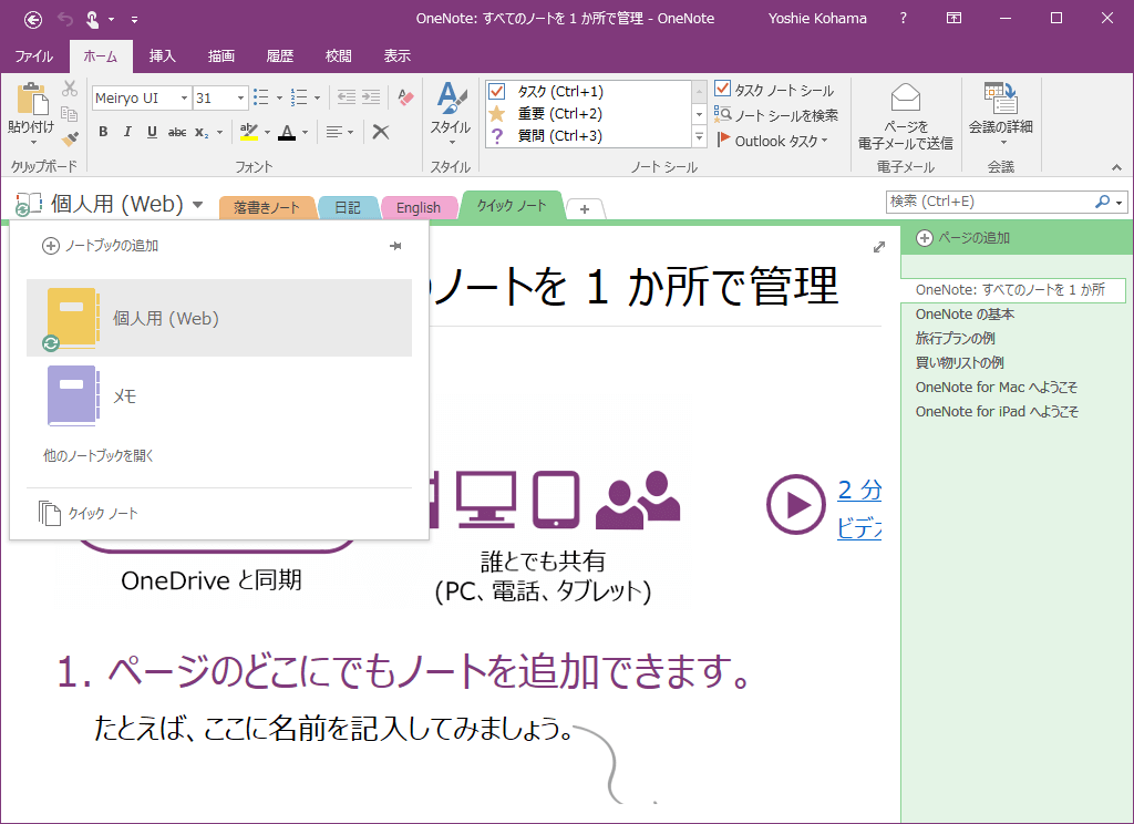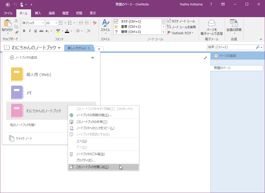 ノートブックウィンドウから閉じたいノートブックを右クリックしてショートカットメニューより[このノートブックを閉じる]を選択します。