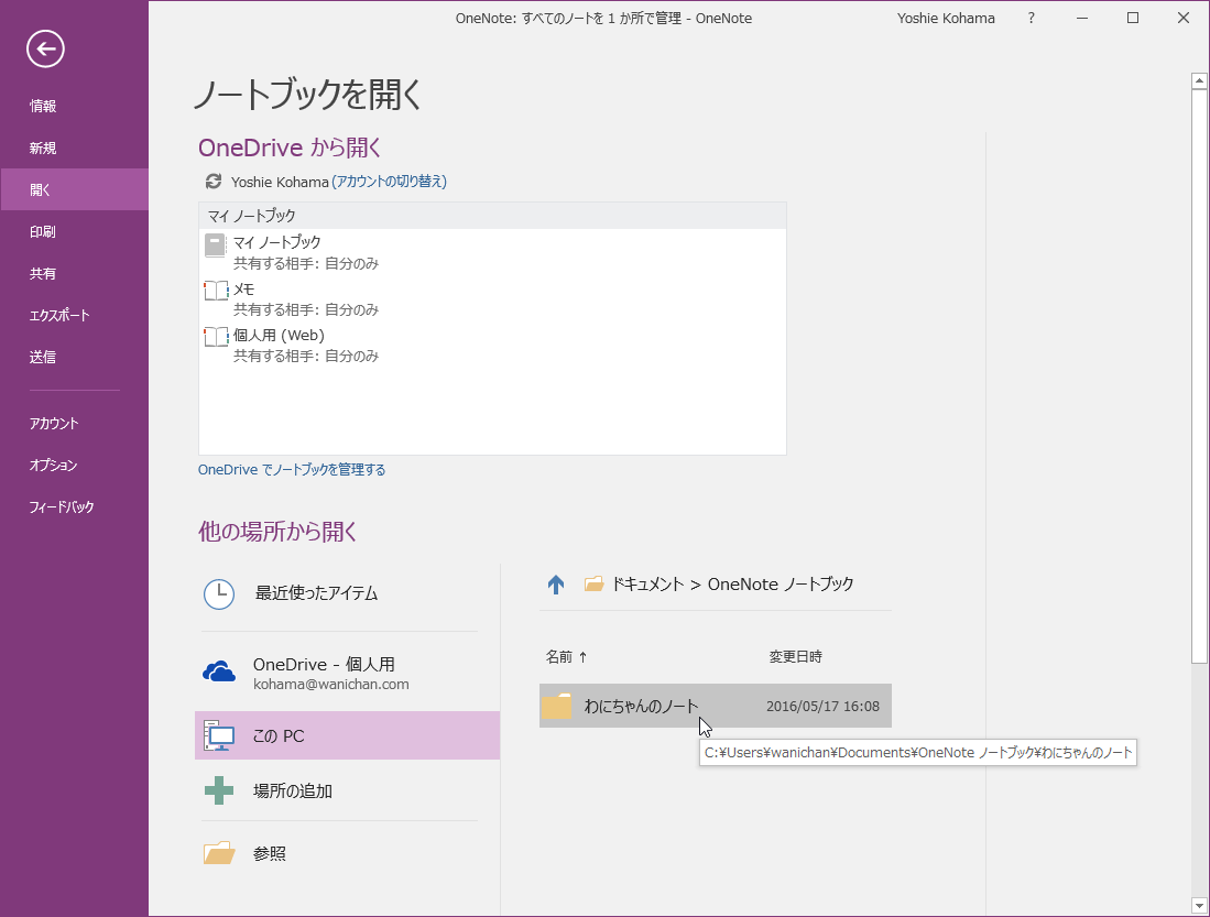- 開く場所を指定します。ここでは、[このPC]のドキュメント内のOneNoteの「わにちゃんのノート」を開きます。