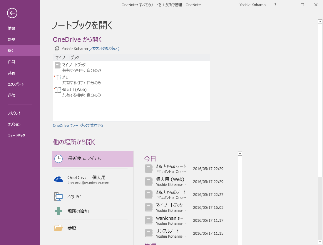 [ファイル]タブを開き、[開く]を選択するか、ノートブックウィンドウから[他のノートブックを開く]を選択して、開きたいノートブックを選択します。