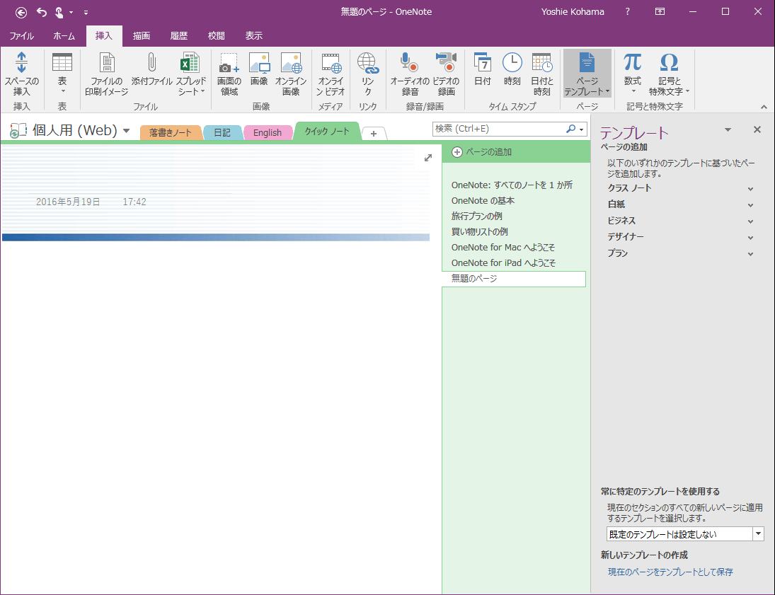 [挿入]タブを開き、[ページテンプレート]をクリックして[テンプレート]作業ウィンドウからテンプレートを選択します。