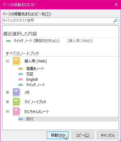 - 移動先のノートブックのセクションを開くと、ページが移動されました。